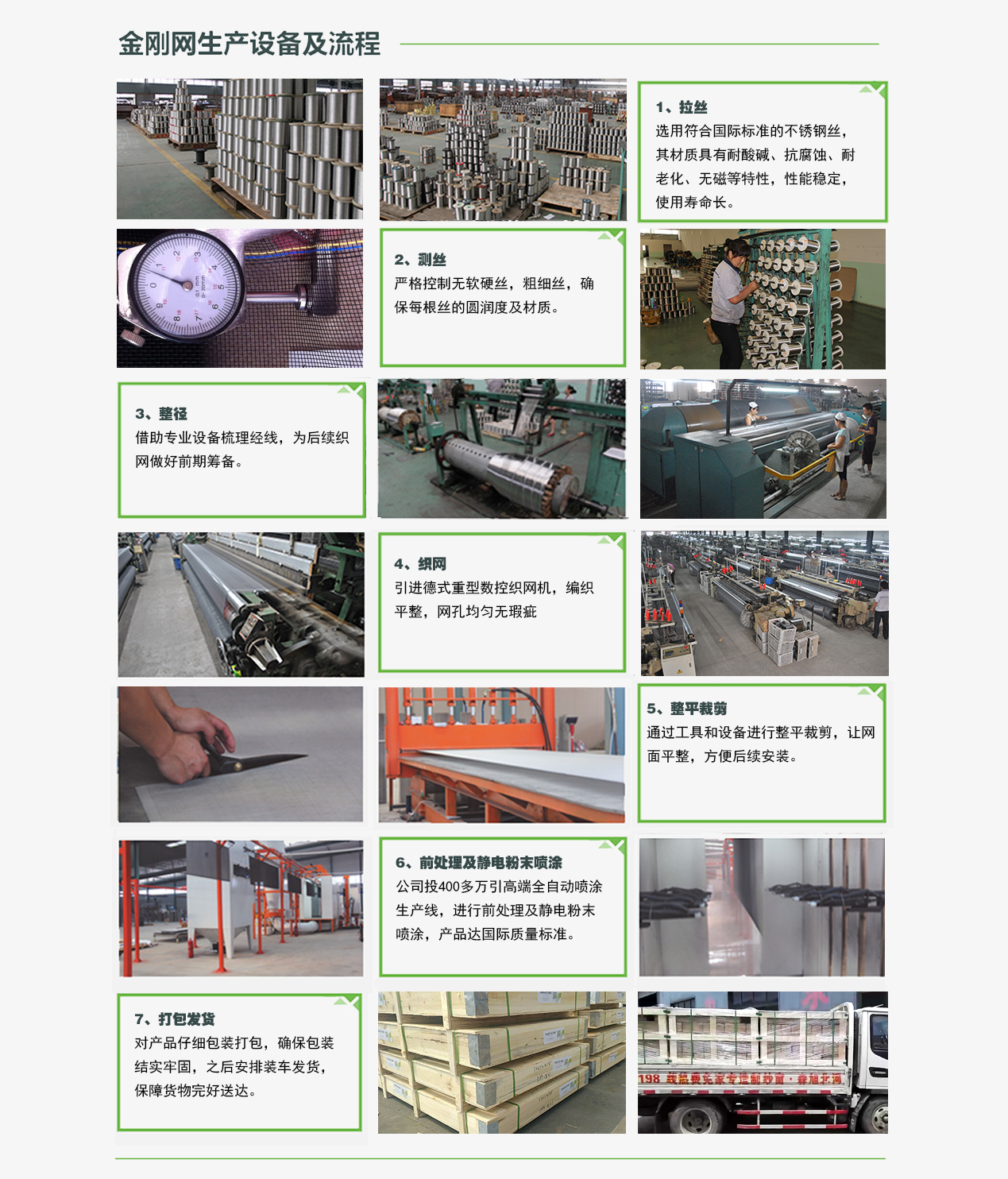 金刚网又名防盗网、安全网、防弹网,是河北旭森公司旗下主打产品之一。该产品选用优质不锈钢丝,经过先进数控机器平织工艺编织而成,经裁剪、矫平、表面去磷钝化处理后采用静电粉末喷涂处理,网面平整,目数均匀,经纬弯曲度一致,透光性能好,防蚊防虫,是防盗、防弹以及居家办公场所安全防护首选。由于该产品多用于门窗制造,一般也称其为金属安全门窗网。